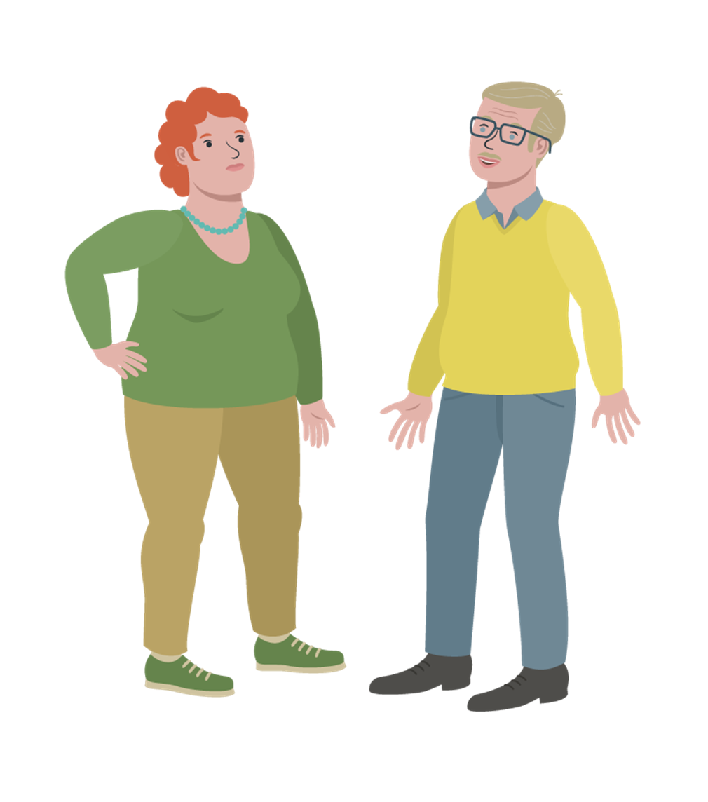 Zwei Personen haben die Arme verschränkt und einander den Rücken zugewandt. Zwischen ihnen befindet sich ein abstraktes Gekritzel.